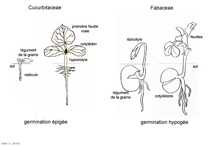 - hypogée : se dit du type de germination de la graine où les cotylédons restent dans le sol (figure 4). C'est le cas chez les fabacées.