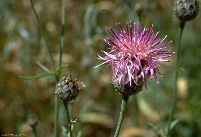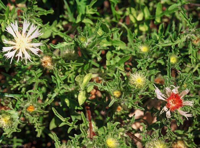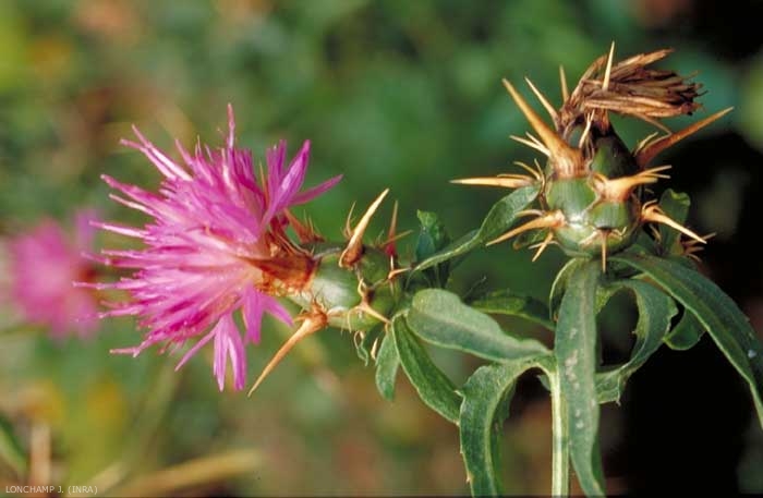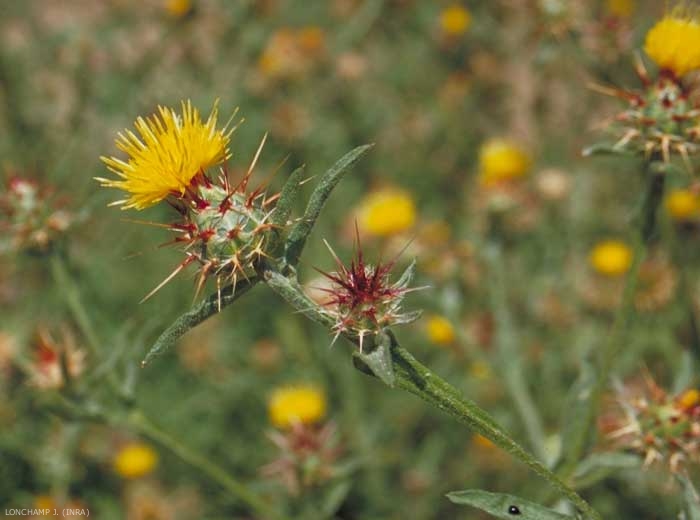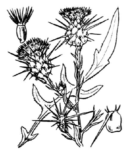 | Dans ce genre, les feuilles médianes et supérieures sont à limbe décurrent sur la tige. Les bractées de l'involucre sont plus ou moins épineuses. Les fleurs périphériques sont rayonnantes, tubulées et à corolle de plus de 6 mm. | ||||