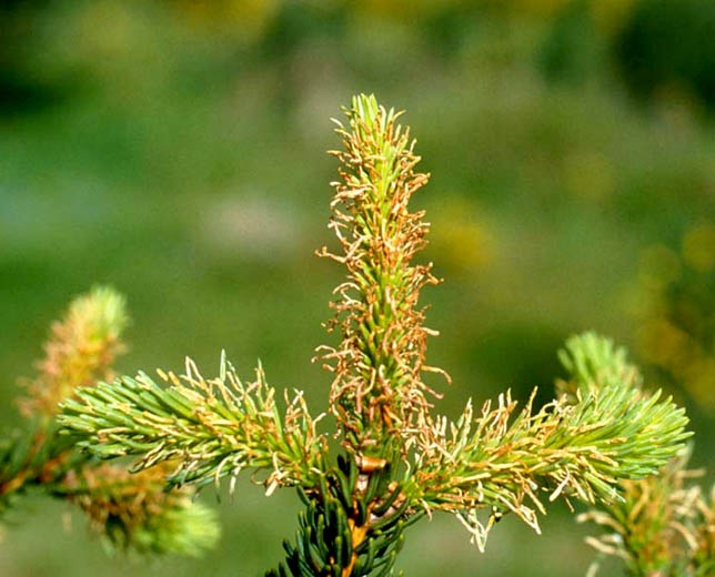 - Chez les résineux, le bord des aiguilles est découpé en dents de scie, puis celles-ci se vrillent, jaunissent et se dessèchent.