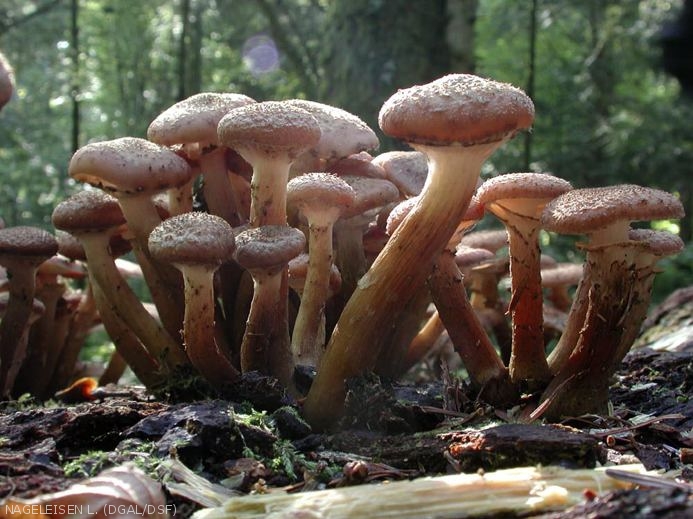 - des cordons mycéliens souterrains (rhizomorphes) constituant des organes de dissémination et de contamination. Pendant la mauvaise saison, ces rhizomorphes constituent les organes de conservation du parasite.