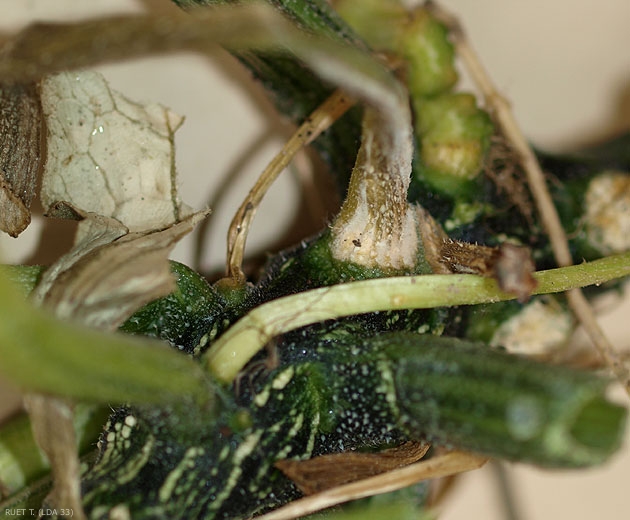 Les fruits sont aussi attaqués : une pourriture humide et molle se développe sur la partie au contact du sol. Les tissus altérés prennent aussi une teinte sombre.