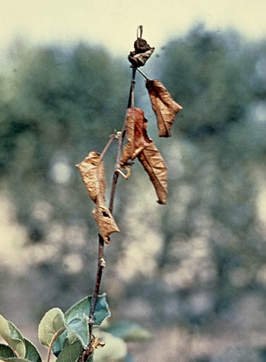 - En été, dépérissement de la partie terminale d'une branche ou de l'axe principale d'une jeune tige qui sèche et casse parfois au niveau de la zone atteinte qui est entièrement évidée. Déjections jaunâtres des chenilles sur les parties jeunes de l'arbre (bourgeons, pousses, nervures, pétioles).