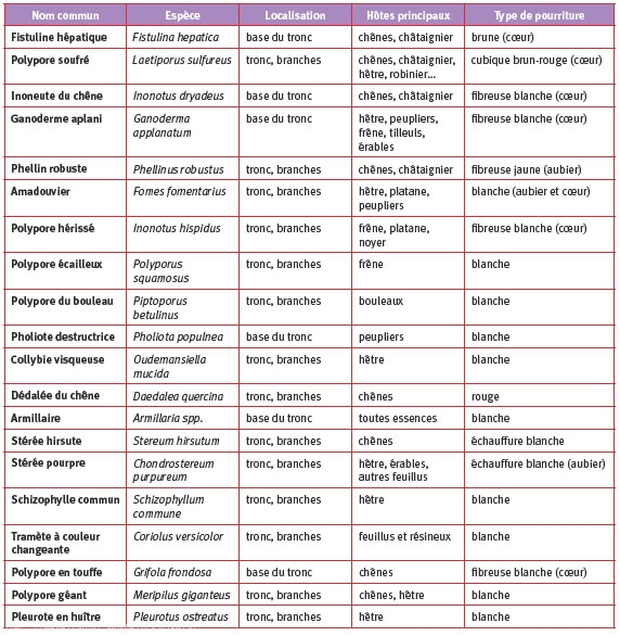 Fistuline hépatique (Fistulina hepatica), Ganoderme aplani (Ganoderma applanatum), Phellin robuste (Phellinus robustus), Amadouvier (Fomes fomentarius), Polypore hérissé (Inonotus hispidus), Polypore écailleux (Polyporus squamosus), Polypore du bouleau (Piptoporus betulinus), Pholiote destructrice (Pholiota populnea), Collybie visqueuse (Oudemansiella mucida), Armillaire (Armillaria spp.), Stérée hirsute (Stereum hirsutum), Stérée pourpre (Chondrostereum purpureum), Schizophylle commun (Schizophyllum commune), Tramète à couleur changeante (Coriolus versicolor), Polypore en touffe (Grifola frondosa), Polypore géant (Meripilus giganteus).