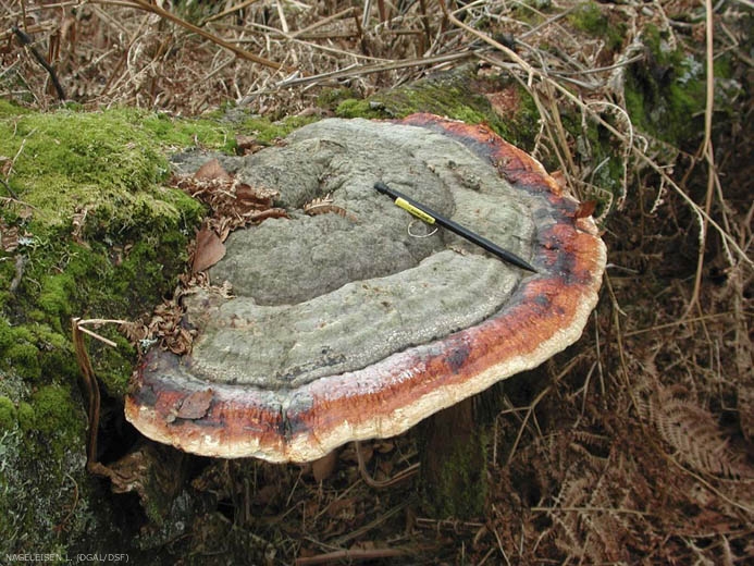 Position systématique : Basidiomycètes surtout Polyporales : Pézize renflée (Rhizina undulata) ; Phéole de Schweinitz (Phaeolus schweinitzii) ; Sparassis crépu (Sparassis crispa) ; Tramète des pins (Phellinus pini) ; Polypore marginé (Fomitopsis pinicola) ; Stérée sanguinolente (Stereum sanguinolentum) ; Phellin de Hartig (Phellinus hartigii) ; Calocère visqueuse (Calocera viscosa).