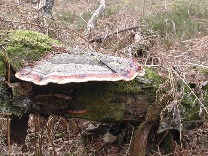 - Fructifications en général sous forme de consoles bien visibles sur le tronc et les branches, émettant une profusion de spores dans l’atmosphère. Celles-ci vont contaminer un arbre au niveau de blessures ou de fissurations de l’écorce.
