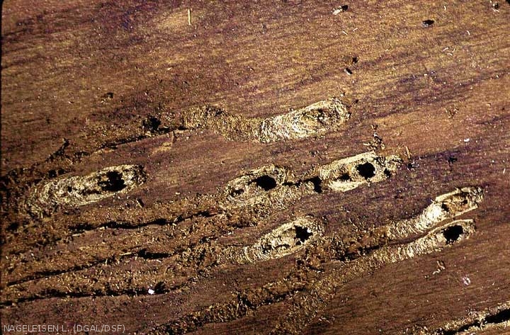 - galeries sous-corticales rayonnantes à partir d'un point central s'élargissant progressivement pour se terminer par une logette de nymphose ovoïde entourée de fins copeaux.