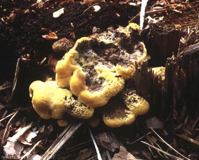 - Carpophores annuels au collet des arbres atteints, mous, sans pied, 1 à 3 cm d'épaisseur, à trame brune, spongieuse, gorgée d'eau. Surface feutrée, du jaune au brun-roux, à marge jaune disparaissant avec l'âge. Pores jaune soufre à jaune verdâtre, puis bruns, irréguliers (dédaléens). Ils atteignent couramment 10 à 30 cm de diamètre, vivent durant 2-3 mois en fin d'été et à l'automne et peuvent persister un an ou deux.