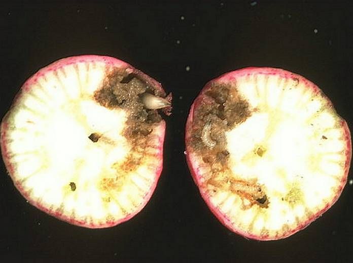 La perte de récoltes peut être potentiellement forte, car les larves creusent leurs galeries directement dans la partie consommable du légume.