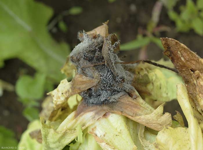 Le Botrytis (Botrytis cinerea), un autre champignon s’attaquant aux feuilles basses (figure 3) et au collet (figure 4) des salades et beaucoup plus généraliste (affectant aussi tomates, courges, haricots, fraises …), produit un feutrage caractéristique gris sur les tissus pourris (moisissure grise) (figure 5). Notons qu'un autre champignon, Rhizoctonia solani, peut occasionner des pourritures au collet des salades (photo 6). Dans ce cas, les tissus lésés ne présentent pas de structures particulières comme du mycélium visible ou des sclérotes.