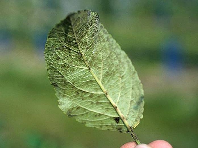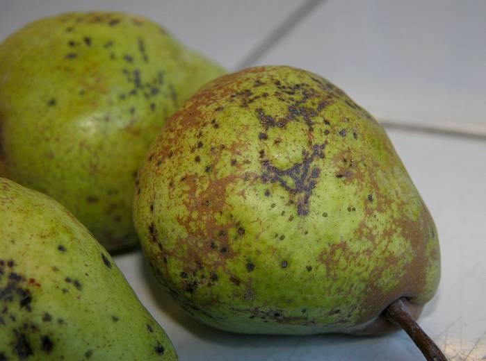 Les symptômes de tavelure sur poirier sont assez comparables à ceux observés sur pommier. Des taches brun olivâtre d’aspect velouté se développent sur les feuilles ; elles ont un contour diffus et sont visibles surtout à la face inférieure du limbe (figures 1 et 2).
