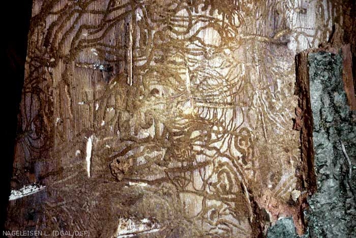 - Les galeries larvaires sont fines et très longues (30 cm) rapidement sinueuses et entremêlées. Elles se terminent dans l'épaisse écorce par une logette de nymphose.