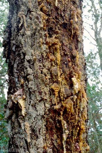 En cas d'attaques multiples, le tronc se couvre de coulures de résine bien visibles de loin.