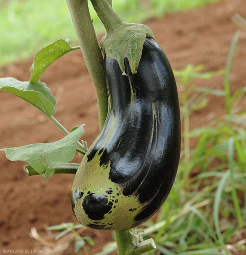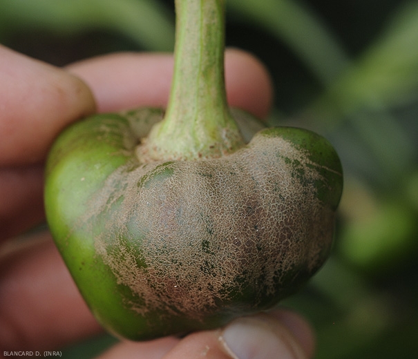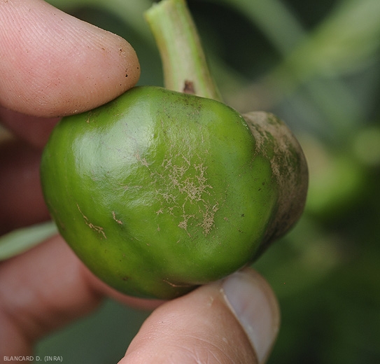 - infestation grave : ce réseau devient si dense qu’il recouvre entièrement le tissu vert du végétal. Dans la plupart des cas, la nervure principale reste intacte, formant une ligne verte sur la feuille devenue marron. Les bourgeons avortent, la plante cesse de croître, puis elle finit par mourir. Les formations subéreuses peuvent apparaître aussi sur fruits, où elles provoquent la mort des cellules détériorées, ce qui entraîne la déformation des fruits (figures 4,5 et 6) qui, souvent, éclatent au niveau de ces formations. Sur fleurs, les étamines noircissent et les fleurs sont déformées.