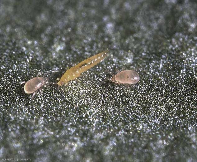 | Stades attaqués | Premier stade larvaire des thrips (figure 1, 2, 4) ; œufs et larves mobiles de premier stade des aleurodes. Tous les stades des acariens. |