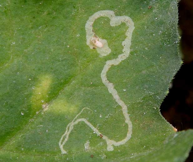 - Symptômes : varient selon la plante hôte : galeries qui s’élargissent au fur et à mesure que la larve grandit (figures 1 à 7). Ces galeries peuvent occuper toute la feuille mais c’est principalement dans les tissus supérieurs du mésophylle de la feuille que les dommages sont constatés.