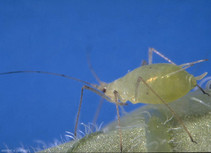 Le puceron vert et rose de la pomme de terre apparaît principalement en été et a besoin soit d’un climat doux, soit d’une serre pour survivre pendant l’hiver.