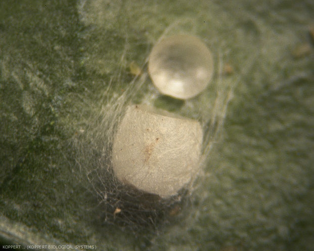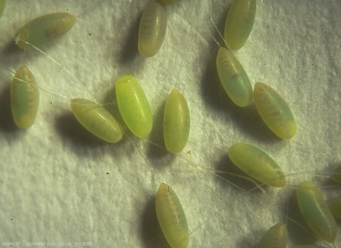 Les oeufs sont ovales, montés sur des pédoncules transparents de taille variable (3.5mm en moyenne). Ils sont pondus soit isolément, soit en groupes de 10 à 40, souvent à proximité des proies potentielles, généralement sous les feuilles. Leurs couleurs passent du vert-clair au gris blanc avec des rayures rougeâtres avant éclosion.