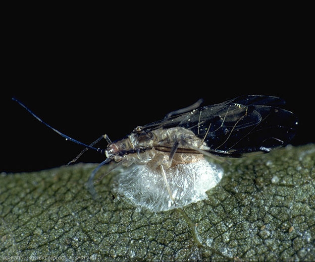 blanche aux téguments transparents (figures 1 et 2), cocon situé sous le puceron "fixé" à la feuille, ce qui forme un socle soyeux.
