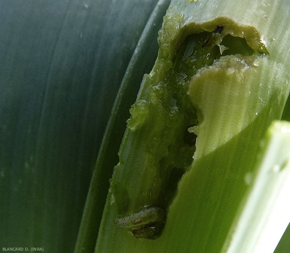 - sur poireaux : minées (figure 1), perforées, en partie consommées (figure 2), les feuilles finissent par présenter un aspect lacéré les rendant invendables, installation de divers agents de pourriture.