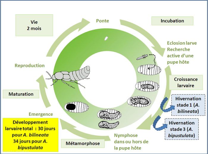 Le cycle de développement est d’environ 30 jours pour Aleochara bilineata, et de 34 jours pour Aleochara bipustulata.