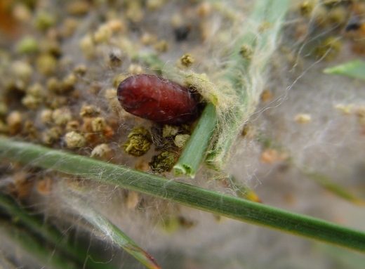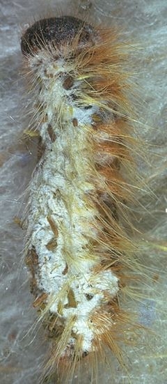 Plusieurs diptères sont aussi connus comme prédateurs (syrphides) (figure 5) ou parasites (mouches tachinaires) (figures 6 et 7) du stade chenille. Des champignons entomopathogènes présents dans les sols comme Beauveria bassiana (figure 8) ou Cordyceps militaris (figure 9) vont aussi contaminer l'insecte et provoquer sa mort. Bactéries (Bacillus thuringiensis) (fugure 10) et virus (Smithiavirus pityocampae) (figure 11).