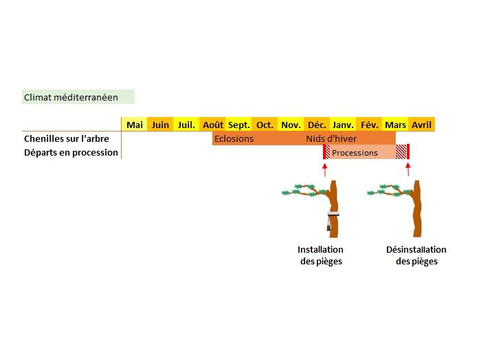 Si vous vous trouvez dans une région avec un climat de type méditerranéen, comme présenté dans la figure 1, les dates d’installation et de désinstallation des pièges à chenilles sont spécifiées dans la figure 2. Il faut toujours compter un lapse de temps suffisant entre la pose des pièges et le début de la procession des chenilles afin d’optimiser l’efficacité du piégeage.