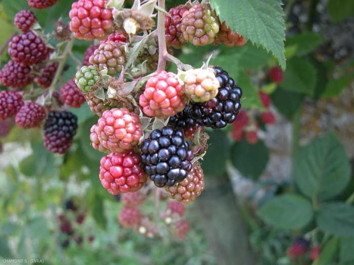 Chez le framboisier la tige est recouverte d'aiguillons (figure), les feuilles sont composées de 3 à 7 folioles dentés, le pétiole est engainant et les fleurs verdâtres sont disposées en panicule lâche terminale. Le fruit est le plus couramment rouge mais peut-être jaune chez certaines variétés. Chez la mûre, les tiges de grande taille (jusqu'à 5 m) sont lisses et les feuilles palmées et formées de 5 folioles. La fleur est grande de couleur blanche à rosée avec des étamines voyantes, les fruits sont rouges à noirs selon les variétés (figures). La pollinisation des fruits est assurée par les insectes. Le nombre de drupéoles conditionne la taille et la cohésion du fruit. Si celui-ci est trop faible, les drupéoles se désolidarisent (maladie de la grenaille) et la récolte impossible.