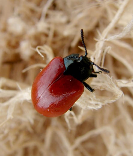 - Adulte : coléoptère de 10 à 12 mm à élytres orangées et pronotum noir