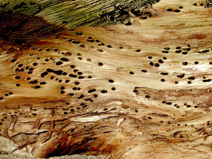 . perforation de l'aubier, structure anormale ("bois madré"), dépréciant une partie de la grume.