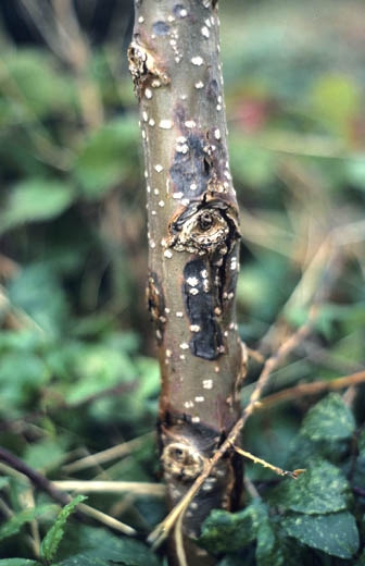 Nécrose brune déprimée et fendillement de l'écorce. Les nécroses peuvent devenir ceinturantes et causer la mort de la tige infectée.