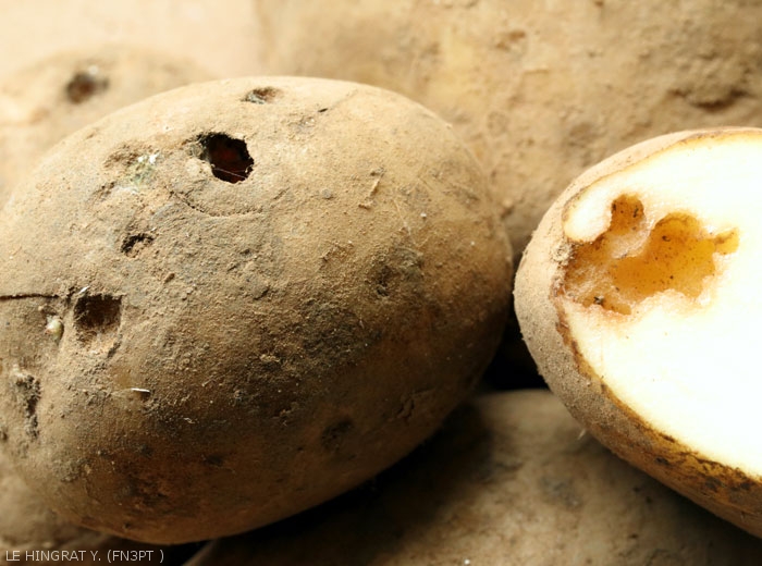 Ce sont surtout les tubercules qui sont touchés : les dégâts se matérialisent par des perforations de la peau (figures 1 à 3), de l’ordre de 4 à 5 mm de diamètre. La limace se nourrit ensuite de la chair en creusant des galeries (figures 3 et 4).