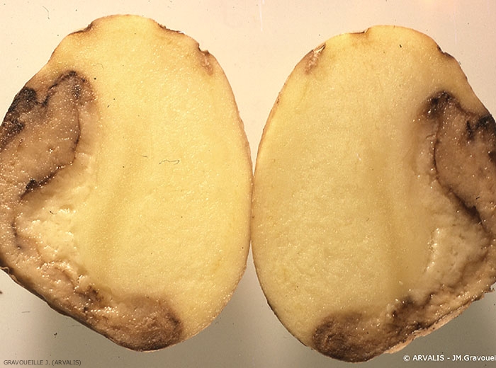 Les Pythium causent une pourriture humide et grise au départ, puis qui brunit au contact de l’air et dégage une légère odeur de hareng. La texture des tissus atteints est relativement fluide, voire crémeuse et les tissus sains et malades sont nettement séparés. Les symptômes peuvent évoluer tant que le séchage n’est pas suffisant (figures 1, 2, 3 et 4).