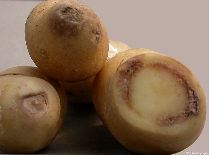On peut observer, dans le cas de certaines conditions de défanage (feuillage déshydraté, forte chaleur ou application en fin de journée sur plantes fanées), des dégâts sur les tubercules avec une pourriture au talon et/ou un brunissement de l’anneau vasculaire (figures 1 à 3).
