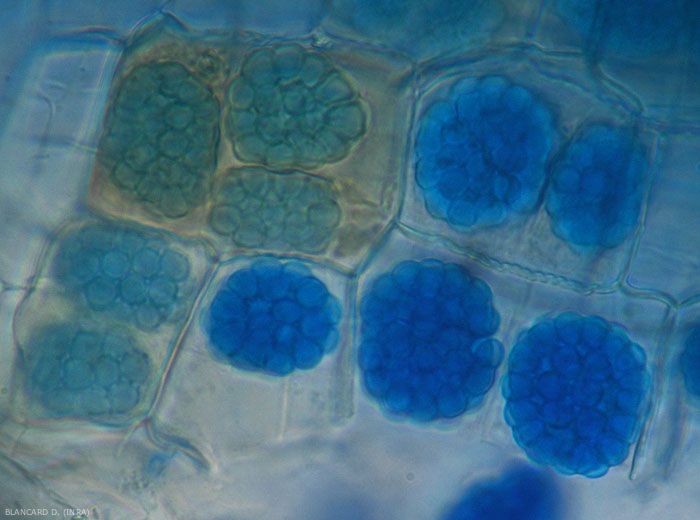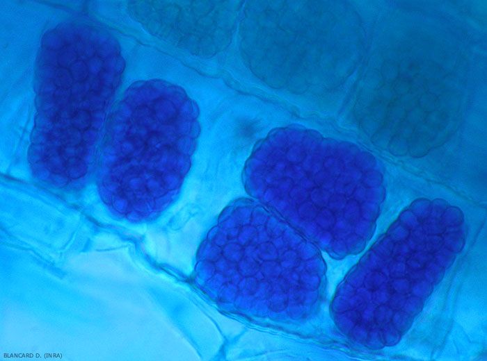 - Cystosores (spongy masses) renfermant plusieurs spores de repos (resting spores) présents dans les cellules du cortex de l'épiderme ;