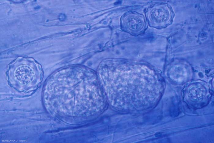 • Conseils : au laboratoire, les sporanges des Mucorales et des agents de mildious foliaires sont plutôt aisément observés à l'aide d'une loupe binoculaire et d'un microscope photonique. Ceux des pathogènes racinaires sont plus difficiles à détecter : les Pythium spp. sont plutôt peu visibles dans les tissus végétaux altérés. C'est moins le cas des Phytophthora spp., et encore moins des Olpidium spp. qui sont bien visibles dans les cellules du cortex des racines de divers légumes (salades, concombre, tomate, etc.). Si les sporanges desagents de mildious sont ne sont pas visibles sur les tissus foliaires, placer les échantillons dans une chambre humide et réaliser des observations à intervalles réguliers par la suite.