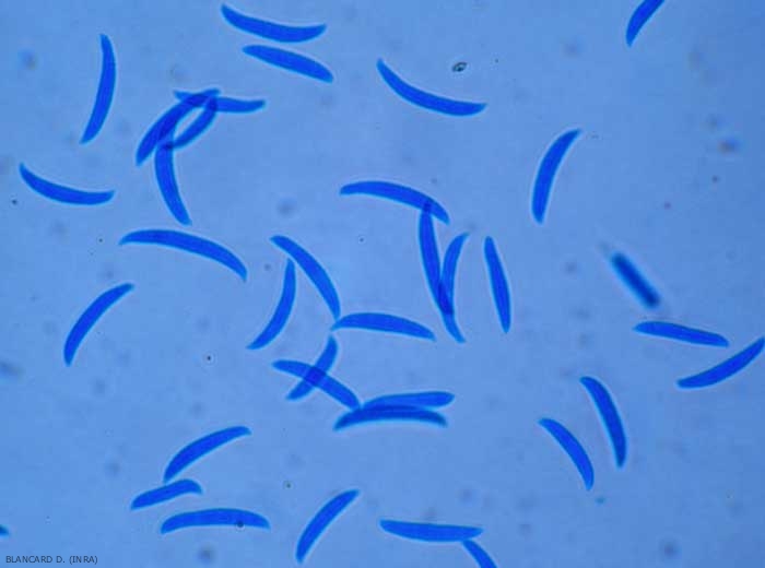 • Conseils : au laboratoire, l'observation des conidies présentes sur les tissus végétaux altérés ne pose normalement pas de problème. Repérées grâce à la loupe binoculaire, elles peuvent être détaillées après préparation microscopique entre lame et lamelle et observation au microscope photonique. Si elles sont absentes, placer les échantillons dans une chambre humide et réaliser des observations à intervalles réguliers.