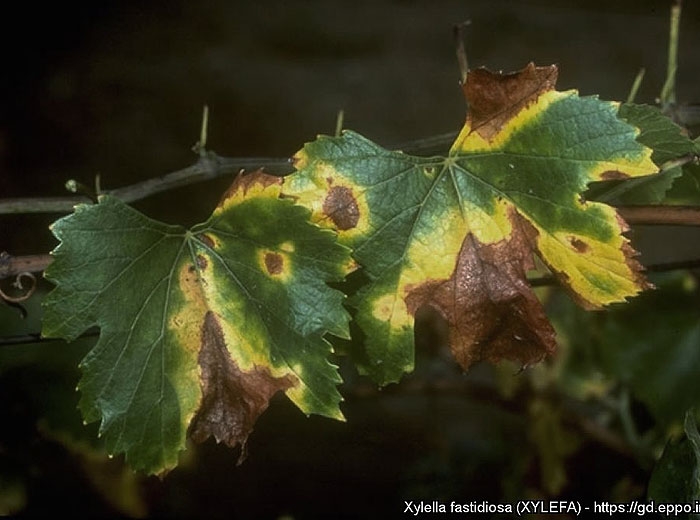 Les premiers symptômes de la maladie de Pierce sont foliaires et apparaissent surtout durant les périodes estivales chaudes et sèches, ou lorsque les ceps de vigne subissent des stress hydriques. Ainsi, des roussissements et des dessèchements partiels des feuilles se manifestent. Les lésions du limbe en vert sont sectorielles et/ou périphériques, de couleur brunâtre, jaunes à rougeâtres en bordure. Le dessèchement du limbe s'étend progressivement, et par la suite des feuilles entières se nécrosent et chutent, seuls les pétioles restant attachés.