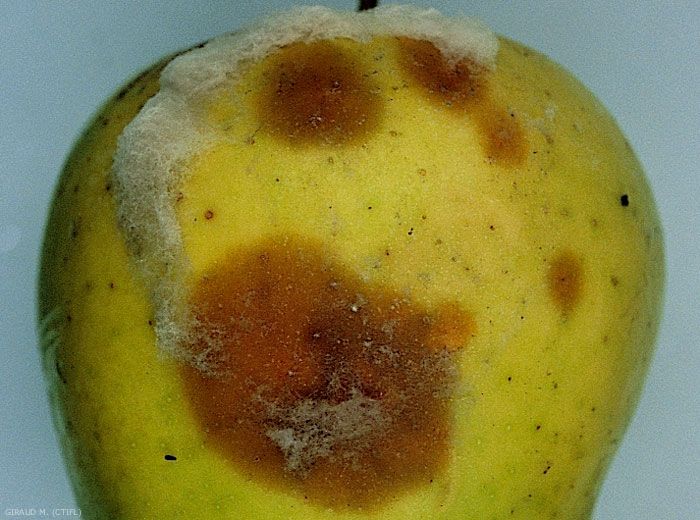 Le Botrytis de l’oeil se manifeste sur fruit, dès fin juin, au niveau de la cavité oculaire (figure 1). On aperçoit une décoloration, puis une tache brune à noire, de petite dimension, qui évolue peu. Bien que très discrets, les symptômes sont normalement visibles à la récolte. Le Botrytis de l’œil évolue rarement vers une pourriture généralisée. En conservation le Botrytis se présente comme une pourriture brune (figure 2), en général molle et humide (qui peut être cependant mais rarement très ferme). Elle apparaît en général dans les premiers mois de stockage. Les lenticelles sont parfois auréolées de brun rouge. En conditions humides, on observe le développement d’un feutrage mycélien blanc à l’obscurité, devenant gris souris à la lumière, porteur de conidies (figures 3 et 4). Les fruits atteints contaminent les fruits sains par simple contact et provoquent des nids de pourriture. A l’intérieur des loges ovariennes un feutrage gris est parfois présent.