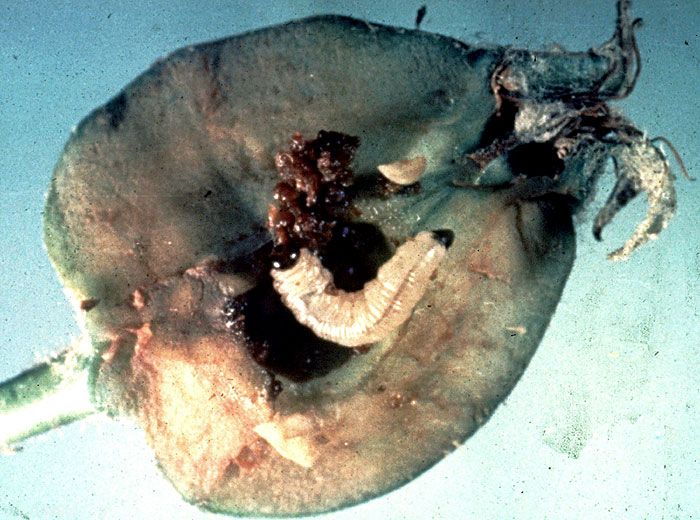 La larve est cylindrique, légèrement incurvée entre 12 et 14 mm. Sa couleur est blanche à vert jaunâtre (figures 2 et 3). Sa tête est foncée, petite et sphérique. La larve possède 3 paires de fortes pattes thoraciques et 7 paires de fausses pattes abdominales (fausse chenille). La larve possède une odeur caractéristique de punaise. Chaque larve peut détruire de 4 à 5 fruits en un mois.