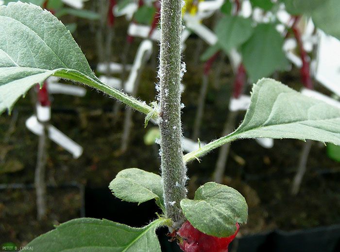 Sur les rameaux et les branches (figure 1), les piqûres des pucerons provoquent la formation de boursouflures puis de galles (figures 2 à 4) et enfin de chancres qui peuvent permettre l’attaque de pathogènes secondaires, notamment des champignons.