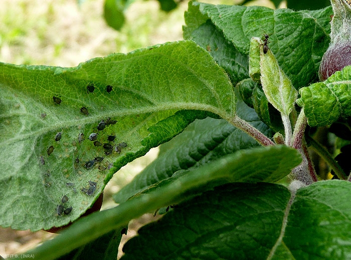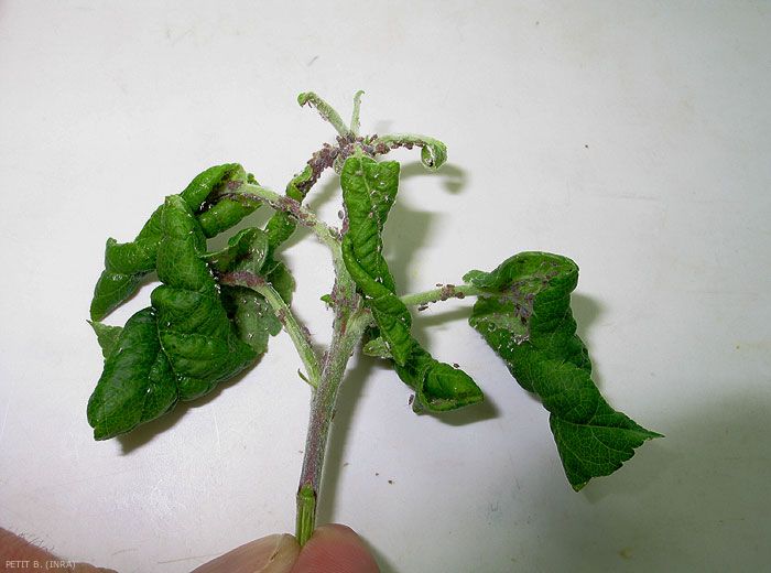 Les colonies importantes (figures 1, 2 et 3) provoquent l’enroulement et la déformation des feuilles (figures 4 à 10) et des rameaux (pseudo-galles).