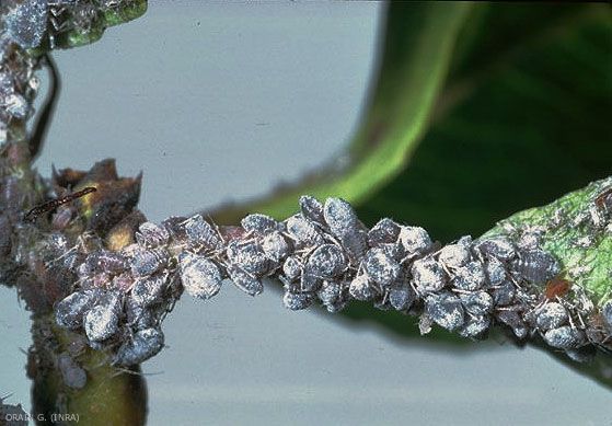 Les adultes sont aptères ou ailés et mesurent deux mm (figure 1). Ils sont brun marron (ailés) ou brun pourpré (aptères), recouvert d’une cire laineuse blanchâtre caractéristique ressemblant à de la ouate. Le rostre est puissant. Les antennes sont courtes et les cornicules sont réduites à un pore.Les larves sont plus petites et le rostre est proportionnellement plus long.