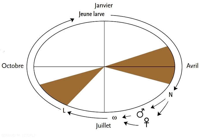 L’adulte mesure dix-sept à vingt mm d’envergure. Les ailes antérieures, dans la partie basale, sont chinées de brun, bleu, argenté et noir. L’extrémité est blanche tachée. Les ailes postérieures sont brun clair, finement frangées. La chenille est de couleur vert olive foncé, effilée aux deux extrémités. La tête, les plaques thoracique et anale sont brun sombre. Les pattes thoraciques sont noires. Chaque segment porte des grandes verrues noires. La chenille mesure dix-huit à vingt mm en fin de développement. Il y a une génération par an. L’hibernation se fait à l’état de jeune chenille. La nymphose a lieu dans des abris foliaires. Les adultes apparaissent en été. La ponte et l’éclosion des oeufs se succèdent jusqu’en fin de saison.