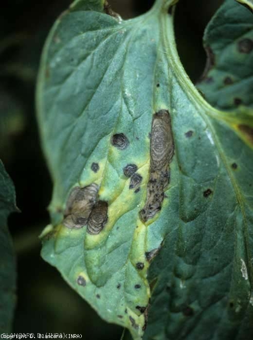 - Description : lésions souvent nécrotiques, plus ou moins étendues, présentant des motifs leur conférant l'aspect d'une cible (target spots). Elles peuvent être humides, voire translucides en début d'évolution. Elles sont surtout visibles sur les feuilles des légumes, parfois les tiges ou les fruits. Sur les feuilles, un halo, souvent chlorotique, peut les ceinturer. Notons que ce halo peut aussi contribuer à l'aspect concentrique de certaines taches.