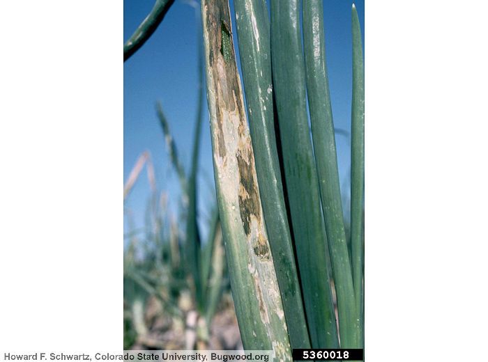 Présence principalement sur les feuilles de taches blanchâtres et humides évoluant vers un aspect de brûlures à