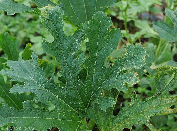 - Observé en plein champ, avec une répartition en foyers dans les parcelles..