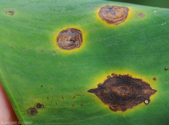 Taches foliaires circulaires à allongées, brun rougeâtre à noirâtre, se nécrosant progressivement (figures de 2 à 4). Des motifs concentriques sont visibles à l'intérieur, ils rappellent ceux d’une cible (target spots) (figure 5).