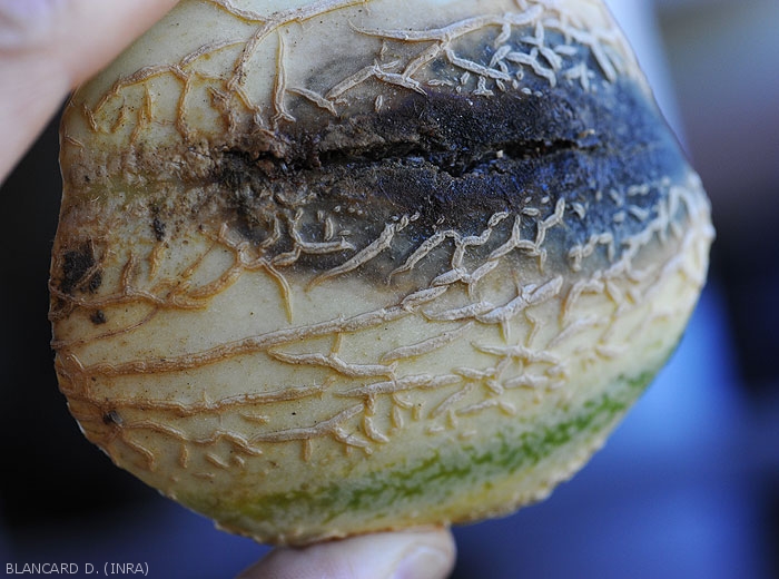 Confusions possibles : Notons que le phénomène de « gommose » est en fait un symptôme assez fréquent chez les Cucurbitacées pouvant accompagner de nombreux problèmes phytosanitaires, mais plus particulièrement ceux liés à la fusariose vasculaire du melon et aux attaques de D. bryoniae ou de Macrophomina phaseolina.