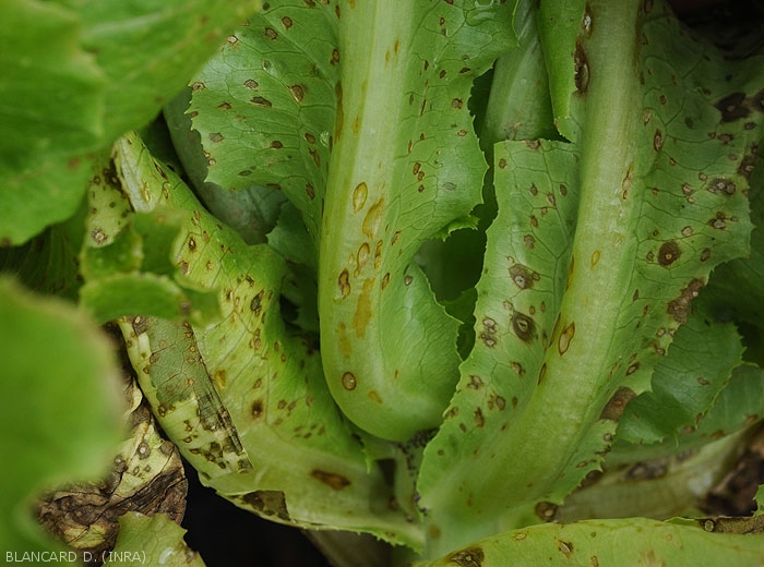 Initialement, petites taches humides, brunes, entourées d'un halo vert pâle à jaune se développant plutôt sur les vieilles feuilles (figure 1 à 5).