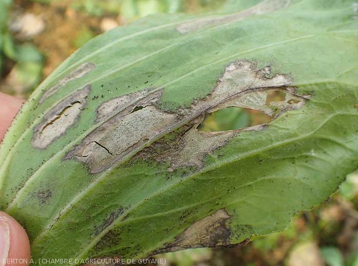 - Les tissus foliaires finissent par se nécroser, se décomposer et tomber. comférant parfois au limbe un aspect criblé (figure 6). Parfois, seules les grosses nervures subsistant par endroits.